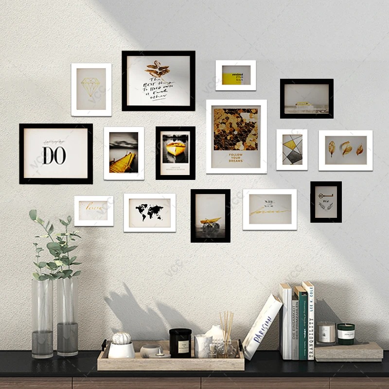 This is a collection of 14 pieces of photo frames of three different sizes. Half the photo frames have black color borders whereas the other half have white color borders. This set of frames is perfect for family photo collage or to create gallery wall art of photo frames.
